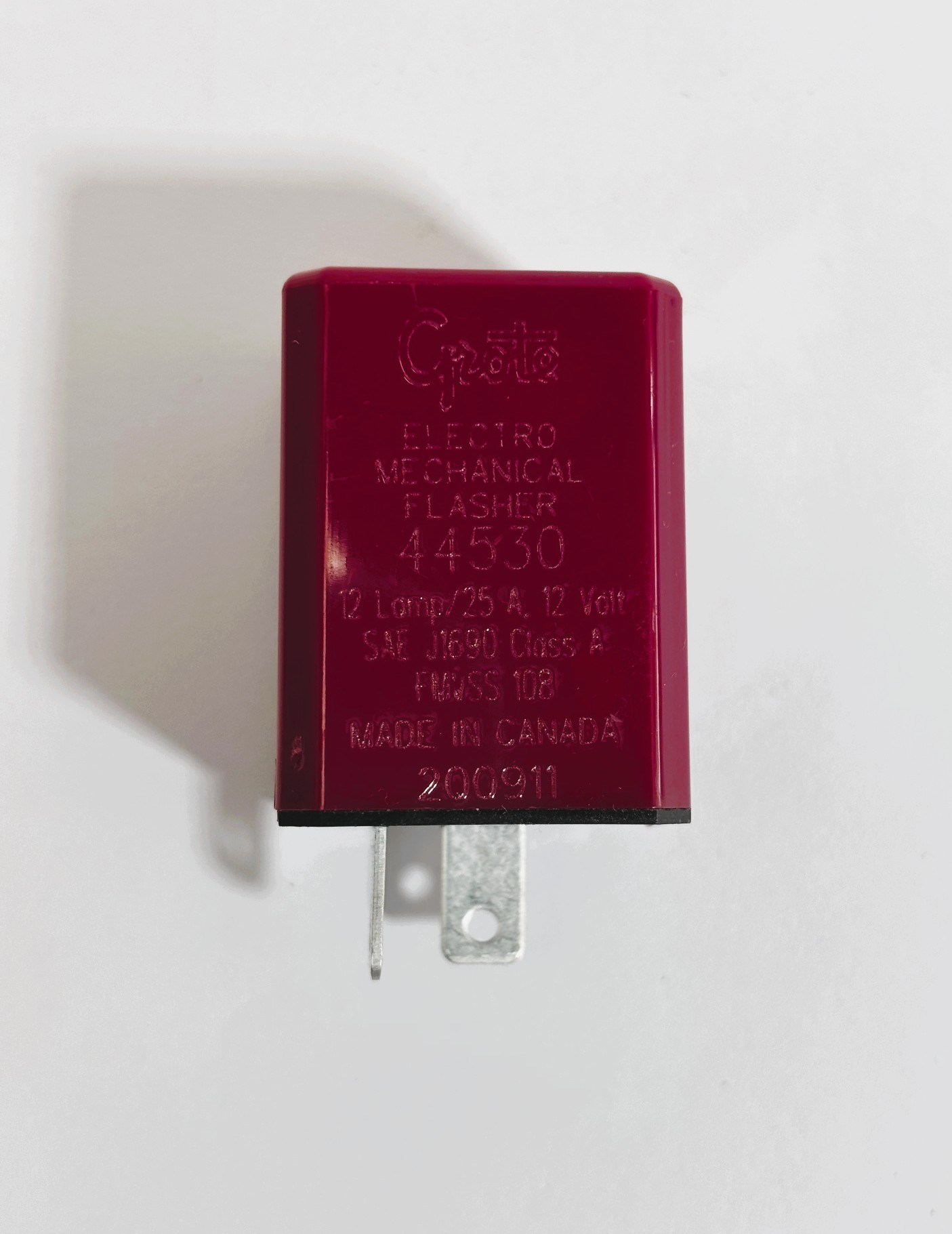 PN#44530 SKU#10693 Brand: Grote. 12 Light Electromechanical Flasher. Housing Color: Red. Amperage: 2A – 25A. Standards: J1690. Design Current Load: 1 – 12. Style: 2 Pin. Shape: Square. Exceeds SAE 100-hour test. 60 – 120 flashes per minute. Fits in a round flasher socket. Less than 4-millivolts per amp voltage drop. Made in Canada.