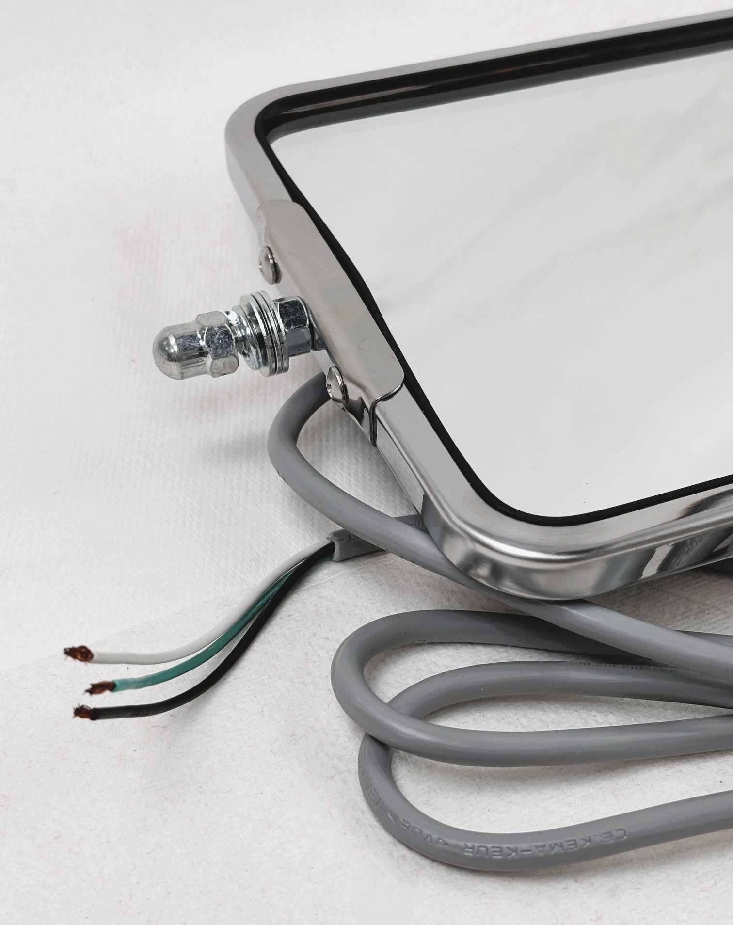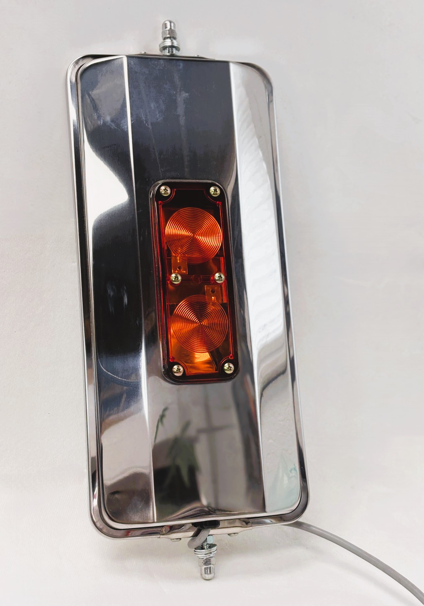 PN#601288 SKU#13949 7″ x 16″ Stainless Rounded Angle-Back Heated & Lighted West Coast Mirror Head. 7″ x 16″ flat mirror provides a wide view to help minimize blind spots. Built-in heater evenly defrosts glass to maintain visibility. First-surface electro-chrome glass eliminates glare for maximum safety. Flush-mount marker light provides additional safety by signaling other drivers. Polished stainless steel construction for a bright, rust-free accent. Universal stud mounts easily attach to all standard loops.