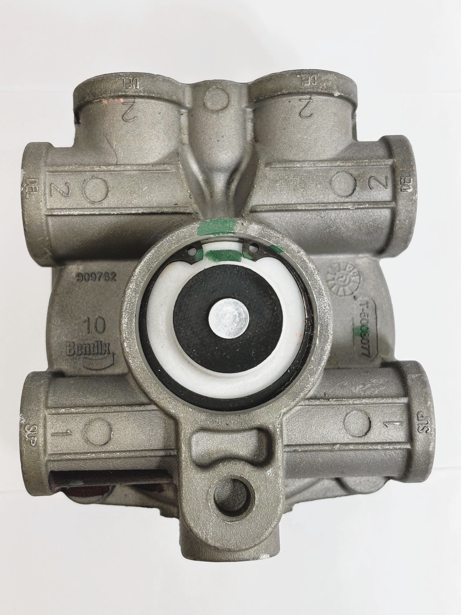 PN#801123 SKU#14654 Brand: Bendix. Horizontal delivery ports. Crack Pressure: 4.0 psi. Supply Ports: 1/2″ NPT (2). Delivery Ports: 3/8″ NPT (4), 1/4″ NPT (1). Service Port: 1/4″ NPT.