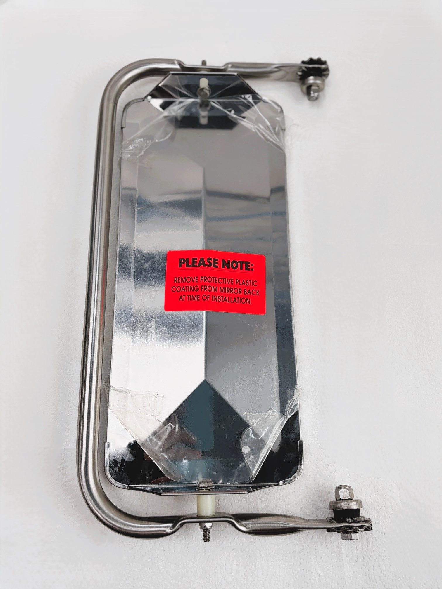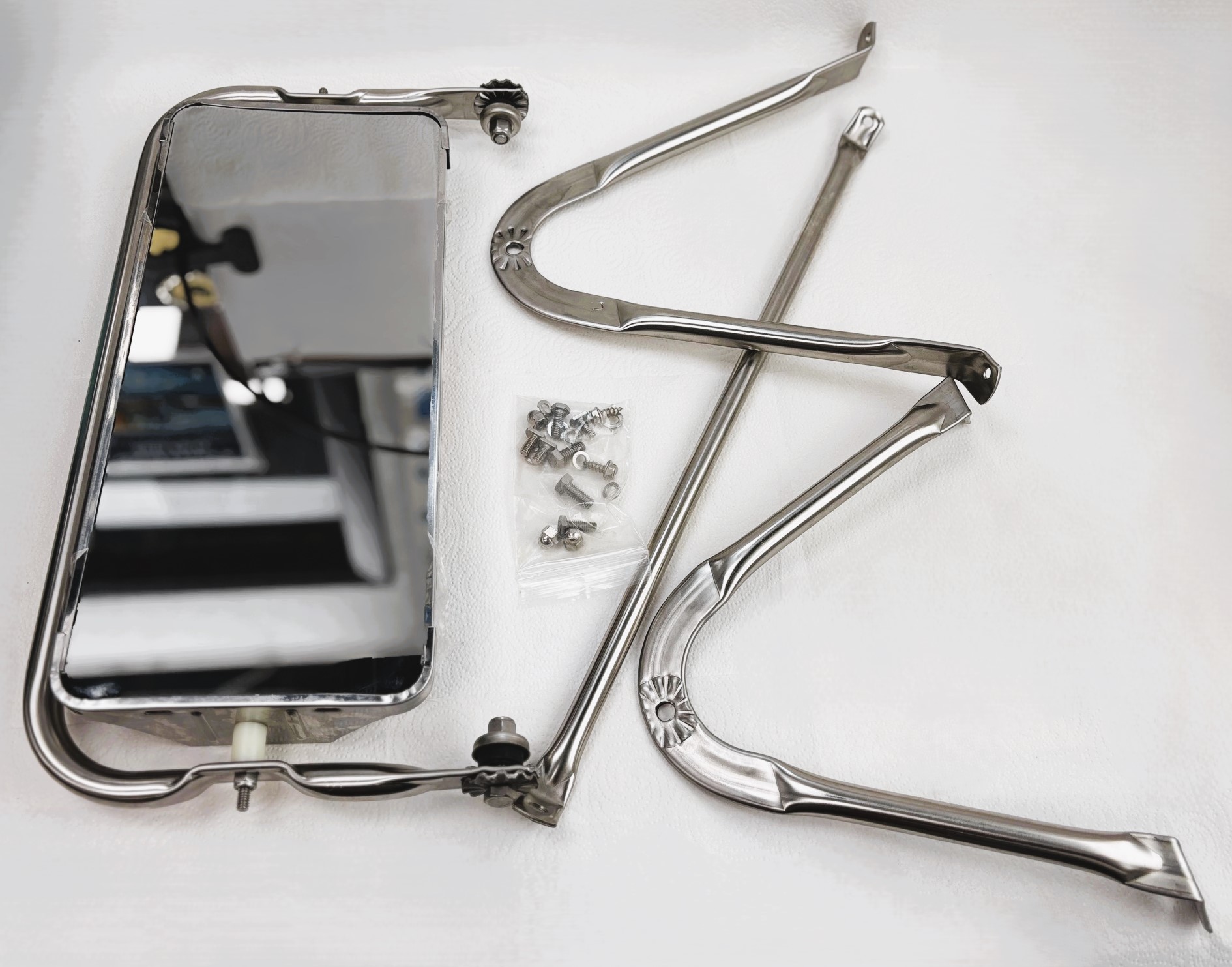 PN#603516  7″ x 16″ flat mirror provides a wide view to help minimize blind spots. No-drill, vehicle-specific design to perfectly match the factory holes. Original equipment, heavy-duty style to provide a perfect OEM replacement. Patented retractable assembly for added clearance whenever needed. Polished stainless steel construction for a bright, rust-free accent. Universal 5/16″ studs easily attach the mirror head to the loop. Material: Stainless Steel. Finish: Polished Stainless. Position: Right Side. Made in USA.
