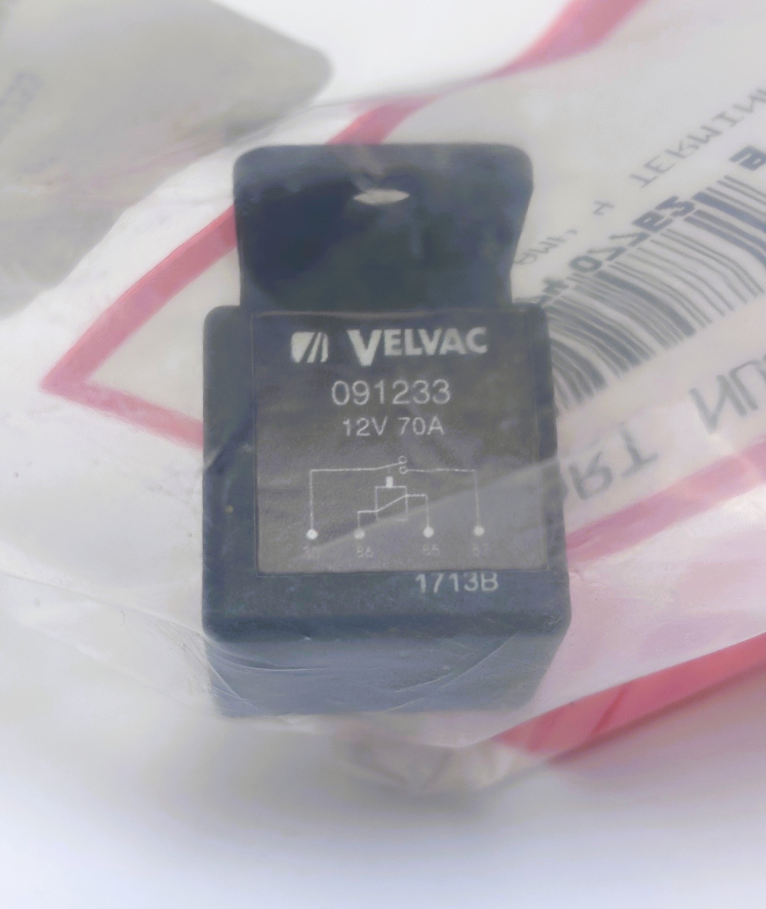 PN#091233 SKU#13249 Brand: Velvac. Heavy Duty Relay. Relay, 12 Voltage, 70 Amp Rating, 4 Terminals, Mounting Tab. Ideal for powering accessories with high voltage draws such as fog lights, power windows and fans. Helps ensure maximum power available to accessories and lights.