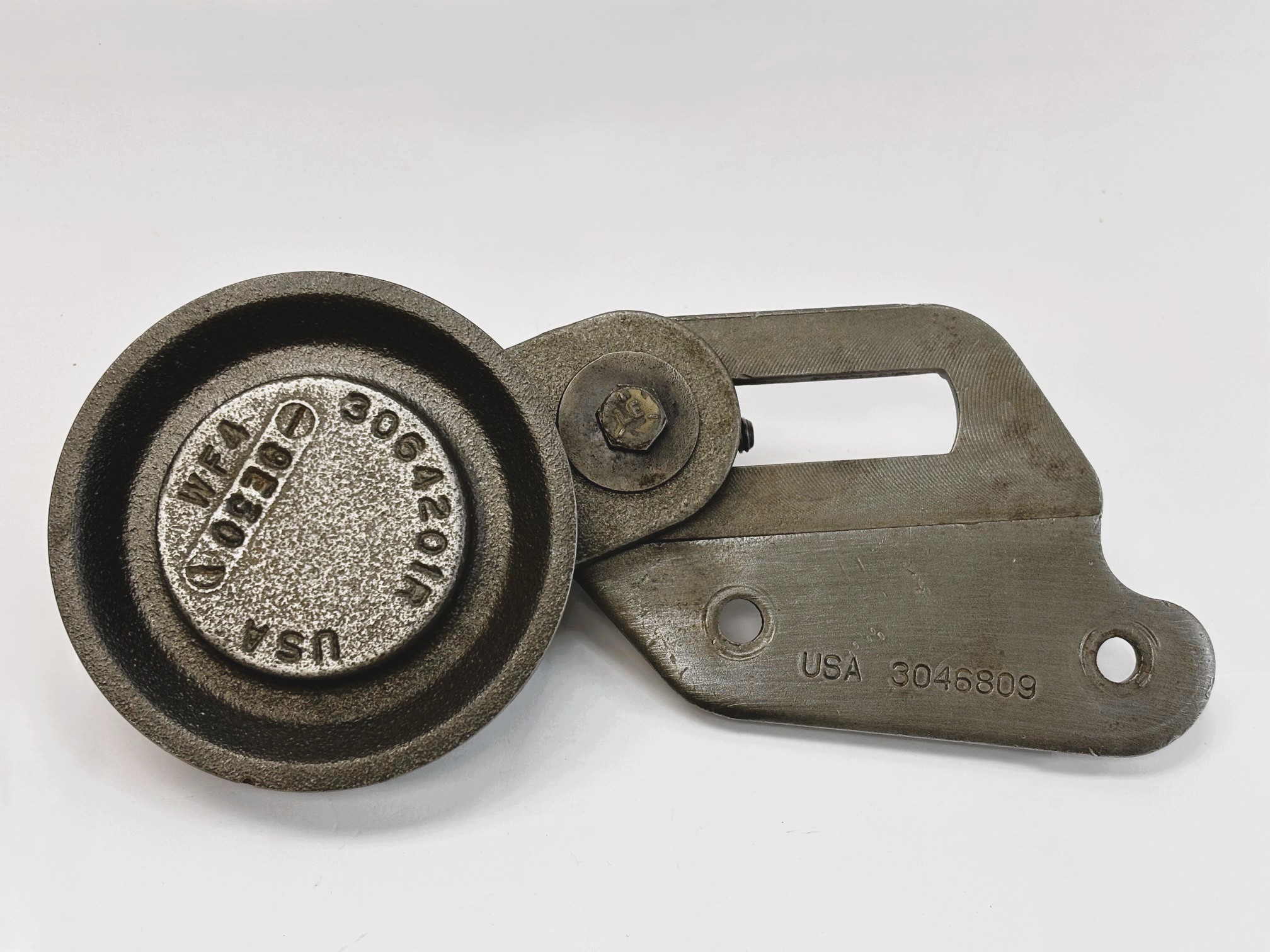 PN#3046809 SKU#21372 Brand: Genuine Cummins Part. Idler Adjusting Bracket. Big Cam 4. Belt Tensioner Pulley. Idler Pulley Part # 3064201R, Pulley Bracket Part # 3046809. Pulley Support Part # 3064200. Pulley Adjuster Part # 3062696. Made in USA.