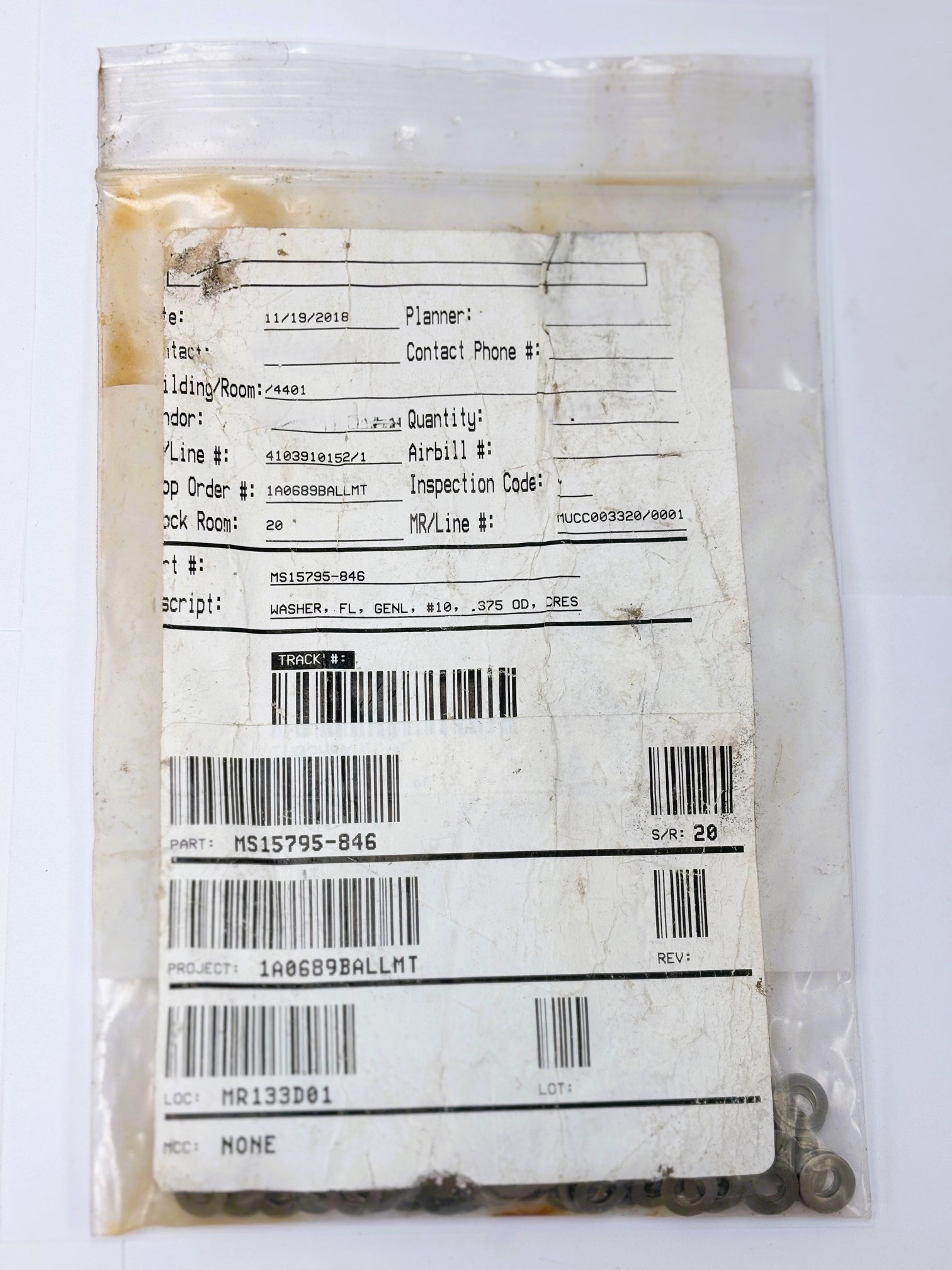 PN#MS15795-846 SKU#4 Type: Aircraft Flat Washer. FL. GENL. #10. OD: .375. CRES. Quantity: 325.
